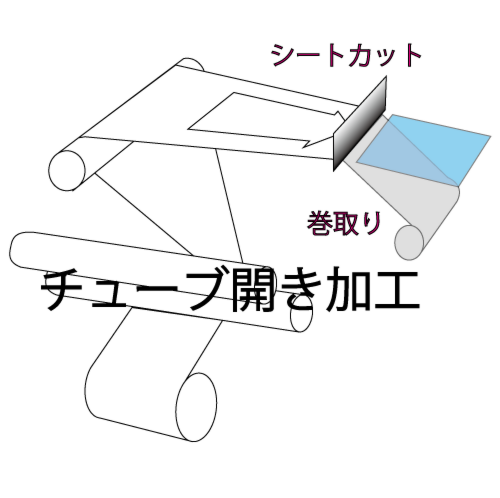 インフレーション製法により出来たチューブ原反を展開、開きながら巻取り、スリット、カットを行うことが可能です。