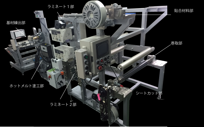 10mからお受け致します2つの素材を貼り合わせる際にホットメルト接着剤を塗布しながら貼り合わせラミネートは勿論、最近では機能性を持つホットメルト種が多く開発され、目的にあった機能種を選ぶことで、それまでとは全く新しい機能を持つ素材に変貌可能です。