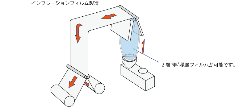 インフレーションフィルム製造方法は上図の通りで風船状に膨らませたフィルムを挟みこんで平らな状態にし、それらをカットして二つに分けてロール製品を作る最も汎用に製造される方法です。
