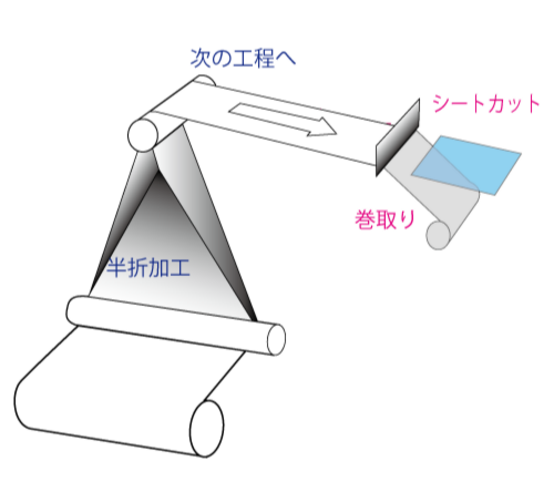 私たちの業界では絵の通り原反と呼ばれるフィルムの巻物がほとんどです。 半分に折りながら加工することを半折加工と呼んでいます。更に半分に折るダブル半折、更に半分に折るトリプル半折。 材質はフィルムがメインですが紙でも可能です。 そして、その逆加工も可能です。 半折から展開して平たい状態にする半折展開加工も承ります。 ホットメルトを駆使した粘着加工、カット品から巻き取りまであらゆる要望に対応。